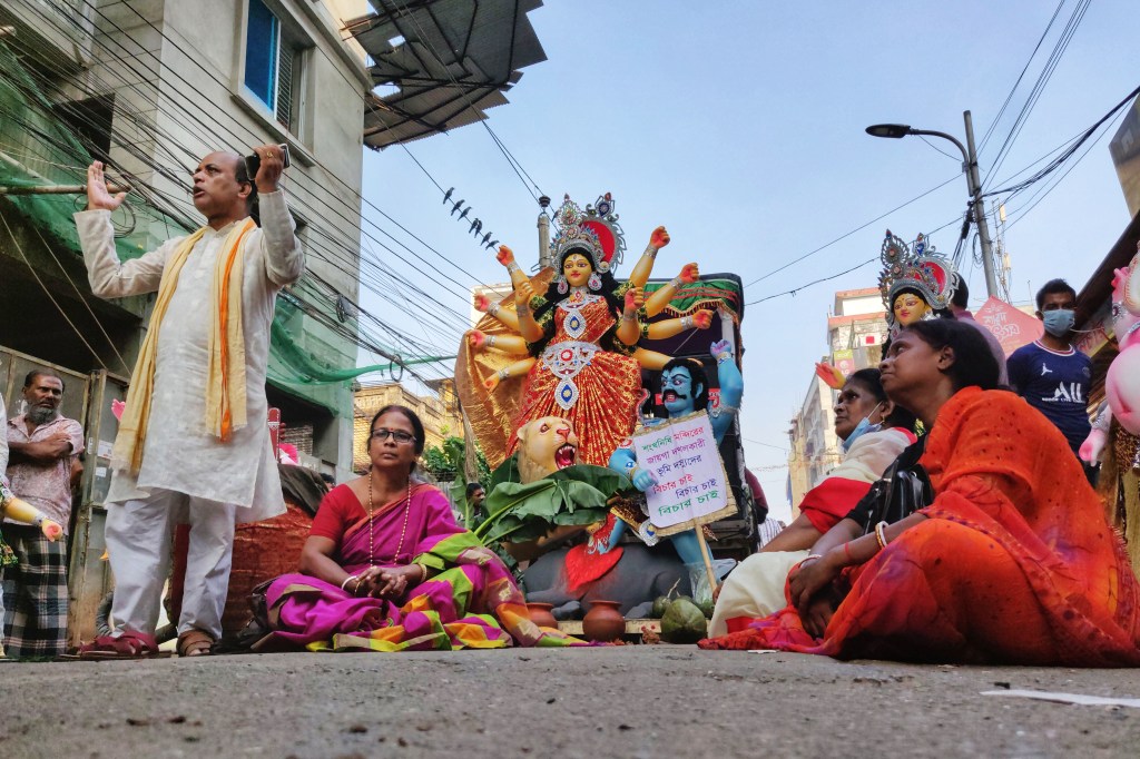 The featured photo is a 2021 photograph of a Hindu demonstration taking place on a roadway in Dhaka.