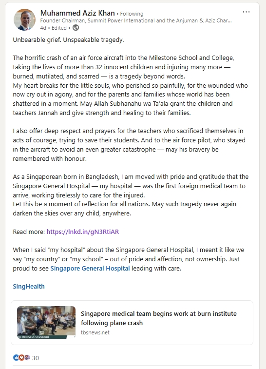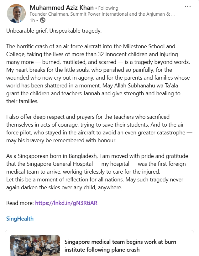 When the Bangladesh-born Singaporean tycoon took to LinkedIn and Facebook on July 24, his words were poignant: “Unbearable grief. Unspeakable tragedy.” He lauded SGH—”my hospital”—for dispatching the first foreign burn‑care team after a Bangladesh Air Force jet crashed into Milestone School and College, killing 32 (now 36) and wounding over 160. By reframing SGH’s institutional aid as a personal intervention, he blurs the line between genuine solidarity and image‑making. He timed his posts to coincide with each new wave of SGH support—first the initial team, then a second contingent—ensuring that every positive development in the relief effort became an opportunity to spotlight his name alongside SGH’s.